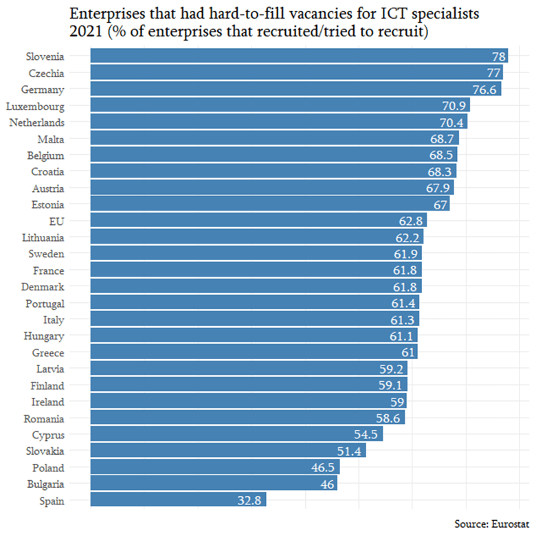 Ωστόσο, η προσφορά ειδικών ΤΠΕ δεν επαρκεί για να καλύψει τη ζήτηση. Οι ευρωπαϊκές επιχειρήσεις αντιμετωπίζουν οξύτατες ελλείψεις σε αυτές τις ειδικότητες, αδυνατώντας έτσι να αξιοποιήσουν στο μέγιστο τα οφέλη που υπόσχονται οι σύγχρονες τεχνολογίες Τεχνητής Νοημοσύνης ενώ, παράλληλα, το τεχνολογικό χάσμα έναντι των ανταγωνιστών τους σε ΗΠΑ και Κίνα διευρύνεται.